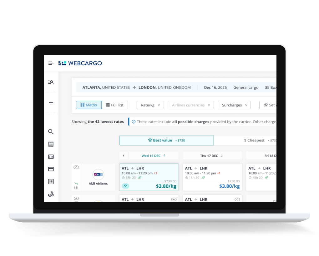 Competitive and accurate static or dynamic rates across 70+ carriers. All the information you need to make smarter booking decisions from your TMS. Including a native integration to WebCargo’s leading air rate management platform.