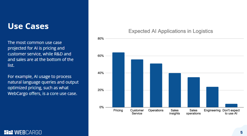 Based on a recent survey conducted by WebCargo by Freightos, logistics professionals overwhelmingly (96%) expect to leverage AI – with 14% already using (7%) or piloting solutions (7%) for pricing or customer service automations.