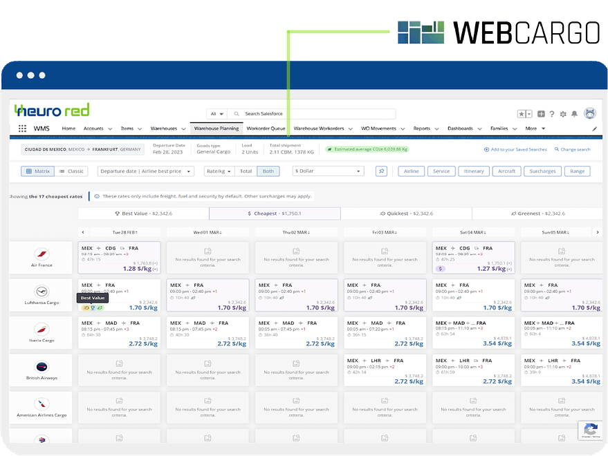 When looking to book a shipment, forwarders benefit from Neurored’s rates management solution and integrations with carriers for spot rates, availability, and schedules. We do these integrations directly with container lines, and for airlines, we integrate using WebCargo’s API.