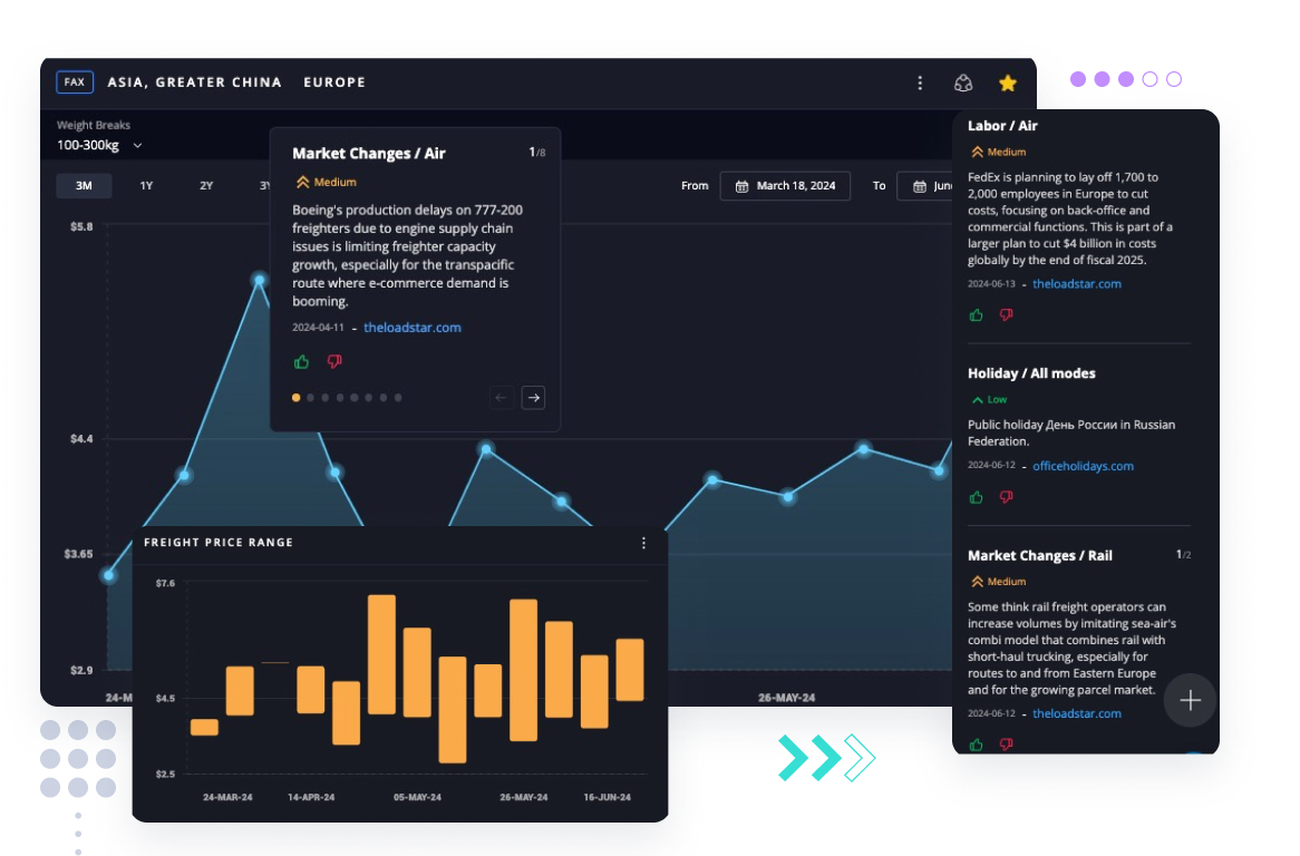 Discover never-seen-before industry-level data with WebCargo Terminal and easily implement changes to optimize revenue with insights on real-time market pricing and transit times for air and ocean. Gain region and lane-level insights including weight break and container data, and mitigate volatility through index-linking, hedging, and derivative trading.