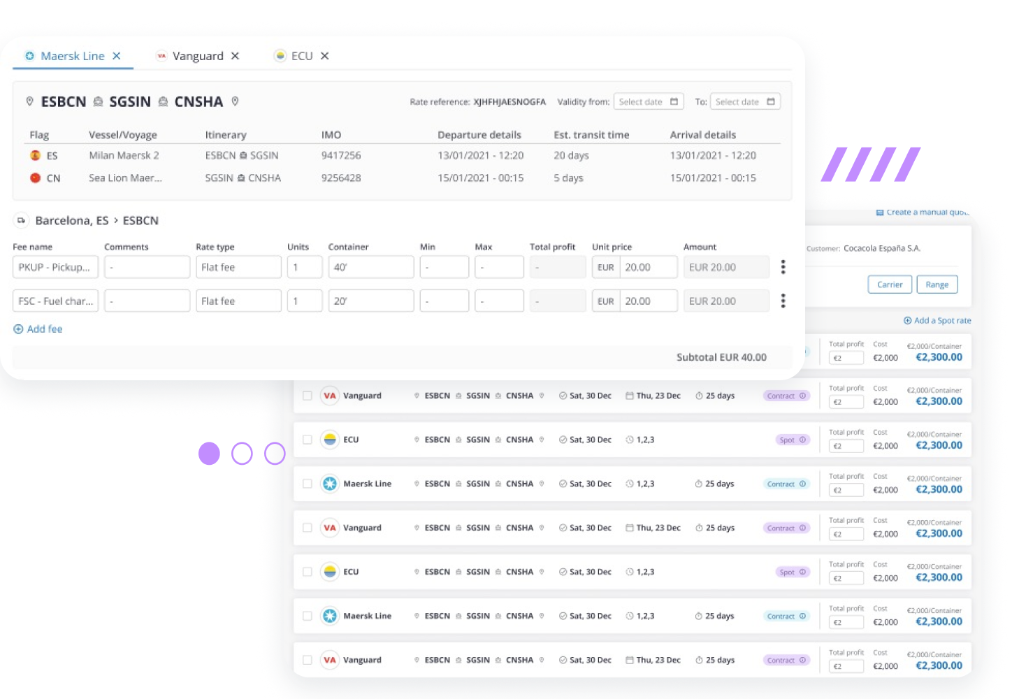 Build open and spot quote for LCL and FCL with proper markups in moments, not hours. All on brand, accurate, account-specific and with outstanding markup control.